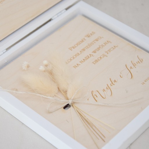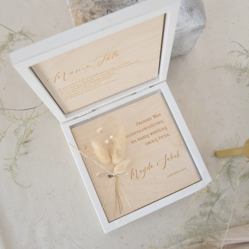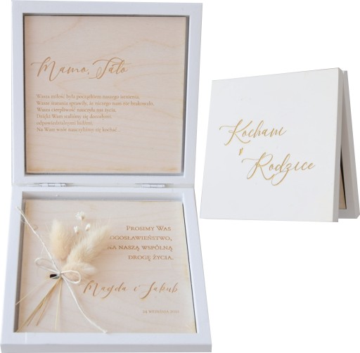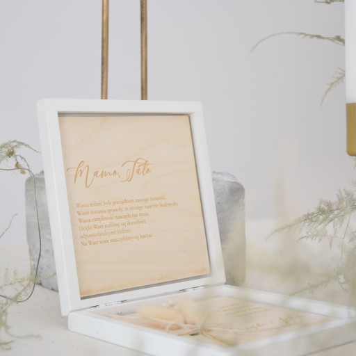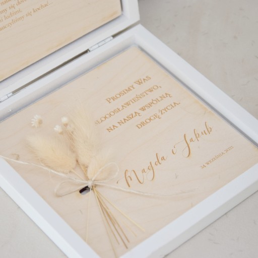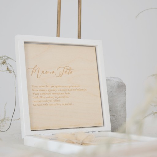 - w środku pudełka znajduje się tabliczka drewniana z tekstem