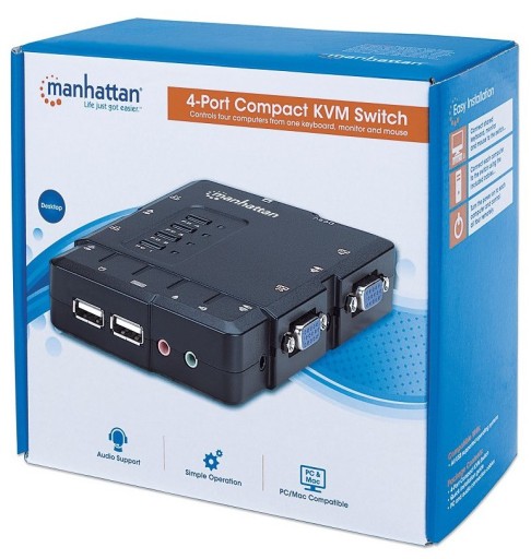 Przełącznik KVM VGA/USB 4x1 Manhattan 151269 umożliwia również przełączanie sygnału audio oraz mikrofonu ,dzięki czemu nie ma już konieczności ciągłego odłączania i podłączania przewodów audio do aktywnego komputera. Za każdym razem gdy przełączony zostanie aktywny komputer, przełączeniu ulegnie również sygnał audio i mikrofon, możliwe jest więc wygodne korzystanie z systemów multimedialnych każdego z podłączonych komputerów.