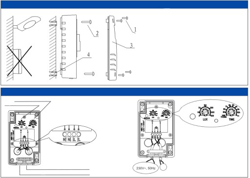 - Regulacji progu natężenia światła, przy którym czujnik ma załączać oświetlenie LUX: 2-300 lux