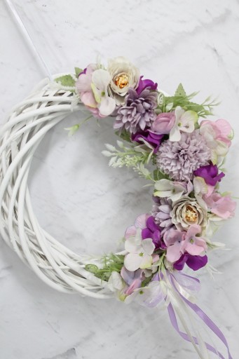 Wianek wiklinowy wybielany o średnicy 25cm udekorowany jesiennymi kwiatami, dali, hortensji, jaskra i astrów.