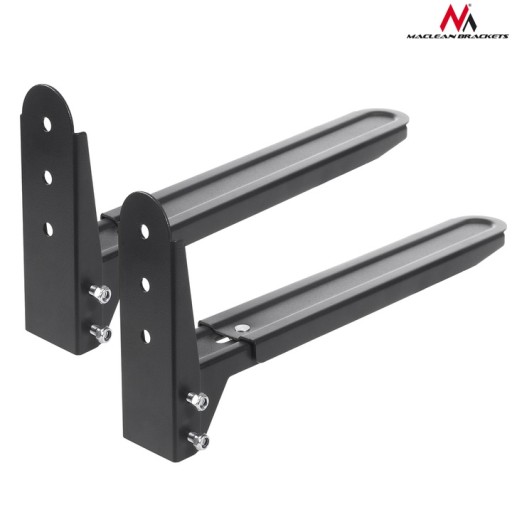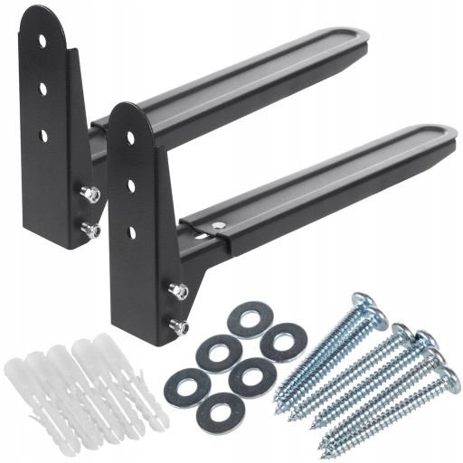 Uchwyt składa się z dwóch solidnych ramion w kształcie litery L o regulowanej długości, mocowanych do ściany za pomocą dołączonych do zestawu wkrętów.