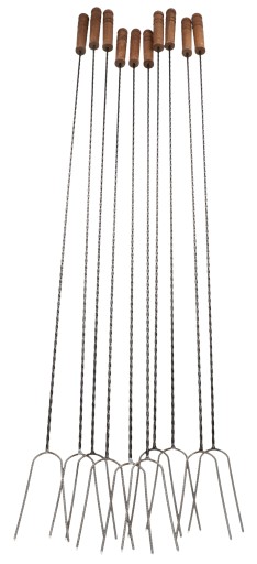 - Widelec został wykonany ze stalowego pręta, a jego odpowiednia długość pozwala na zachowanie bezpiecznej odległości od ognia.