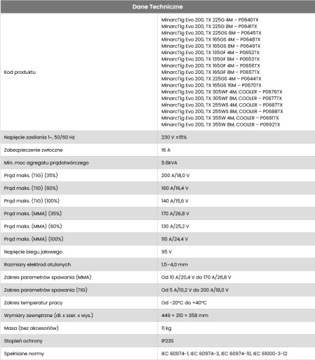 Dostępne są dwa modele: MinarcTig Evo 200 i MinarcTig Evo 200MLP. Mocne źródło zasilające w którym zastosowano technologię PFC zapewnia doskonałe parametry użytkowe, w tym wysoką sprawność energetyczną oraz zdolność do niezawodnej pracy nawet z kablami zasilającymi o długości przekraczającej 100 m.