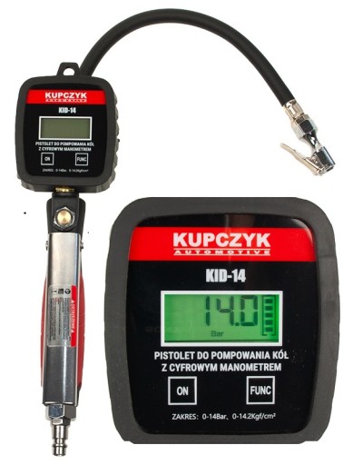 Profesjonalny pistolet do pompowania kół KID-14 Kupczyk wyposażony w czytelny cyfrowy wyświetlacz. Mierzy ciśnienie powietrza z dokładnością do 1% pokazując na wyświetlaczu z dokładnością pomiaru co 0,14 bara. Cyfrowy manometr zapewnia większą trwałość i wygodę niż wersja analogowa. Wyświetla cztery rodzaje skali pomiarów w zakres od 0 do 14B barów (200 PSI, 1400 KPa lub 14 Kgf / cm2). Posiada ergonomiczny uchwyt i korpus manometru co zapewnia dobrą widoczność i prostą obsługę. Pistolet do pompowania kół z cyfrowym wyświetlaczem zbudowany jest z wysokiej jakości materiału w rygorystycznym procesie produkcyjnym zapewniając długotrwałą wydajność, szczelność i szybką obsługę. Urządzenie znajdzie zastosowanie we wszystkich rodzajach pojazdów w których zastosowano zawory Schradera 8V1. Obsłużysz nim m.in.: ciężarówki, SUV-y, samochody osobowe, motocykle a także rowery