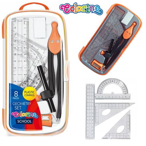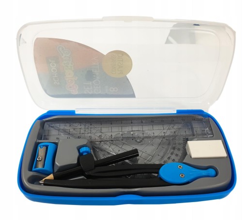 Zestaw geometryczny z przezroczystego, trwałego tworzywa oraz głęboko grawerowaną podziałką. Ramiona cyrkli wykonane zostały z plastiku.