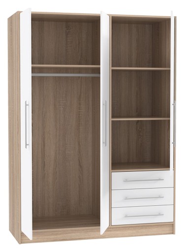 Szafa na ubrania JUPITER JPTS84 to dzieło znanego i cenionego w branży producenta, marki Forte. Jest to niewątpliwie gwarancja trwałości i niezawodności produktu. Mebel bazuje na najwyższej jakości surowcach, a dzięki przemyślanemu projektowi jest w stanie pomieścić dużą ilość różnorodnych ubrań. W projekcie uwzględniono z lewej strony drążek na wieszaki i półkę nad nim, a z prawej dwie półki i trzy szuflady. Dzięki uniwersalnej kolorystyce do szafy możesz dobrać wiele ciekawych mebli z naszej oferty.