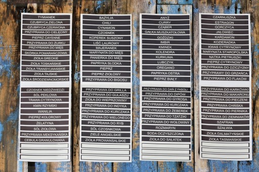- zestaw naklejek zawiera 23 opisane przyprawy oraz 3 naklejki z okienkiem do własnoręcznego wpisania nazwy przyprawy.