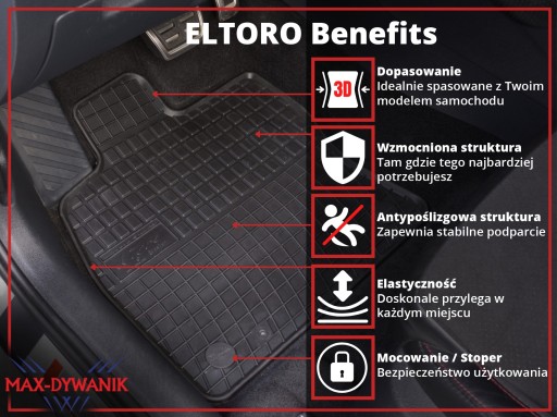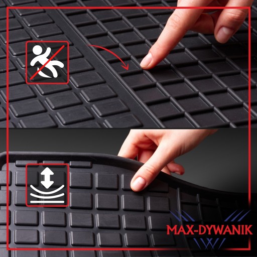 Oferowane dywaniki zostały precyzyjnie zaprojektowane do kształtu płyty podłogowej biorąc pod uwagę nie tylko markę / model samochodu, ale także rocznik oraz w uzasadnionych przypadkach wersję nadwozia. Dywaniki wytwarzane są z najwyższej jakości, trwałej i wzmocnionej mieszanki gumowej niezawierającej substancji szkodliwych dla zdrowia, co zapewnia bezpieczeństwo użytkowania. Estetyczny kołnierz (brzeg) ochronny dookoła dywaników skutecznie zatrzymuje wodę i brud, zabezpieczając oryginalną tapicerkę samochodową przed zabrudzeniem. Dywaniki od spodu posiadają zaprojektowane malutkie kolce, które w dodatkowy sposób chronią je przed przesuwaniem. Dywanik kierowcy został dodatkowo wzmocniony w miejscu najbardziej newralgicznym (miejsce styku pięty z powierzchnią dywanika) tak, aby zabezpieczyć dywanik przed przetarciem. W celu ulepszenia dywaników zostały one zmodyfikowane o zamontowane mocowania wyprodukowane i zamontowane przez firmę MAX-DYWANIK®.