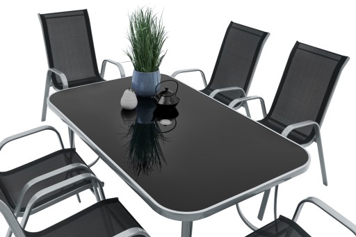 ZESTAW MEBLI OGRODOWYCH idealny do Twojego ogrodu. Stelaż został podwójnie lakierowany proszkowo, co idealnie przystosowuje ten produkt to zastosowania wewnątrz jak i na zewnątrz. Siedzisko krzesła oraz oparcie zostało zrobione z czarnego, elastycznego obicia tekstylnego tak, aby maksymalnie zwiększyć wygodę. Posiada ono dwa oparcia boczne. Użyte materiały nie wymagają częstej konserwacji, są odporne na warunki pogodowe i nie wymagają specjalnych środków do pielęgnacji. Nóżki są dodatkowo zaopatrzone w nakładki z tworzywa sztucznego. Stół posiada blat z czarnej hartowanej szyby o gr. 5 mm, z otworem na wstawienie parasola ogrodowego.