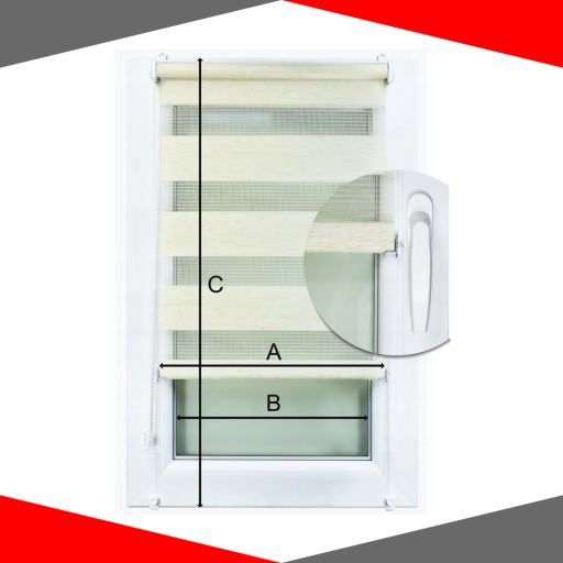Zmierz szerokość szyby (B) i dodaj do tego od 4 do 6 cm, uzyskasz w ten sposób szerokość rolety (A). Należy pamiętać, że roleta powinna być nieco szersza od szyby, ale nie może zasłaniać klamki. Zalecany minimalny odstęp tkaniny od klamki to 0,5 cm.