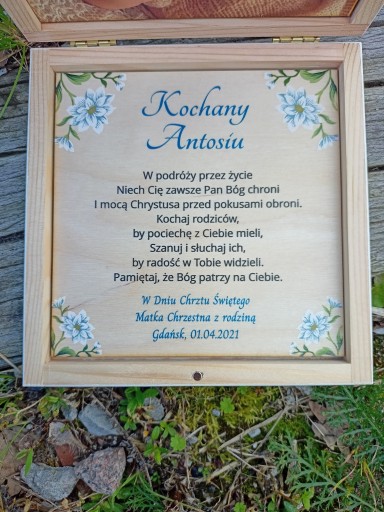 Pudełko możemy również przygotować dla chłopca, kwiatki, aniołek oraz tekst jest w kolorze niebieskim, czyli różowy kolor zastępujemy niebieskim.
