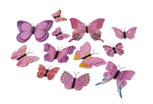 Ozdoba rowerka dziecięcego w postaci dekoracji ramy rowerowej. Zestaw składa się z 12 ozdób mocowanych na magnes lub taśmę klejącą do rowerka dziecięcego. Ozdoby przedstawiają motylki o dwóch rzędach skrzydełek.