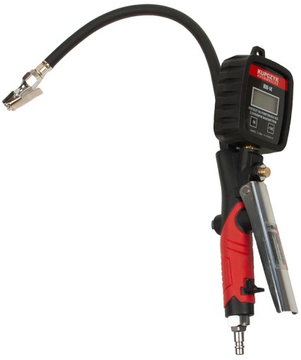 Profesjonalny pistolet do pompowania kół KID-14 Kupczyk wyposażony w czytelny cyfrowy wyświetlacz. Mierzy ciśnienie powietrza z dokładnością do 1% pokazując na wyświetlaczu z dokładnością pomiaru co 0,14 bara. Cyfrowy manometr zapewnia większą trwałość i wygodę niż wersja analogowa. Wyświetla cztery rodzaje skali pomiarów w zakres od 0 do 14B barów (200 PSI, 1400 KPa lub 14 Kgf / cm2). Posiada ergonomiczny uchwyt i korpus manometru co zapewnia dobrą widoczność i prostą obsługę.