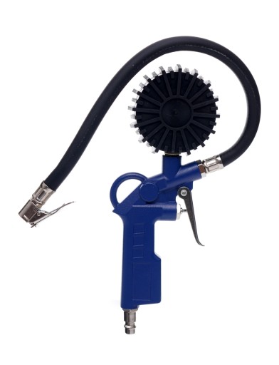 Pistolet do pompowania z manometrem Pistolet do pompowania z manometrem jest doskonały do pompowania i kontroli ciśnienia ogumienia pneumatycznego. Posiada gumową obudowę zegara. Wyposażony jest w zawór spustowy powietrza.
