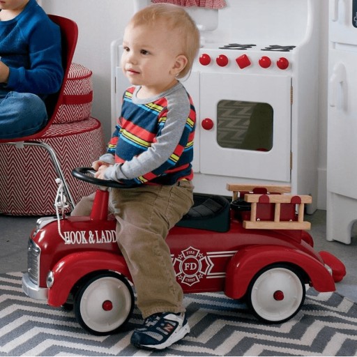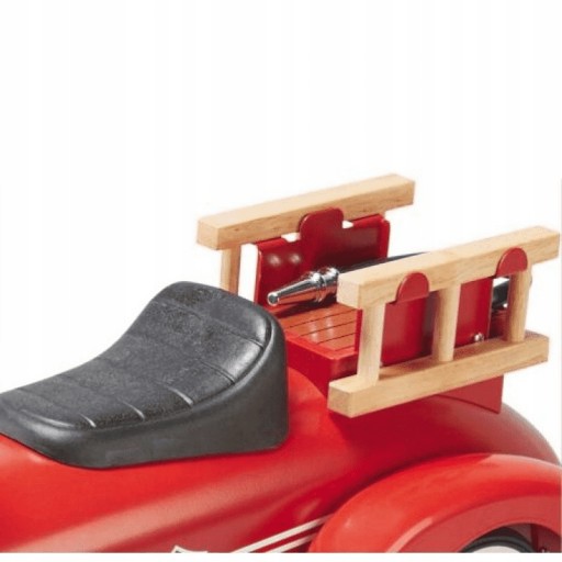 Fotel w pojedzie jest wyprofilowany. Z przodu maski zamocowany jest mały dzwoneczek, który sprawi maluchowi wiele radości. W zestawie jest wąż strażacki i drewniana drabinka.