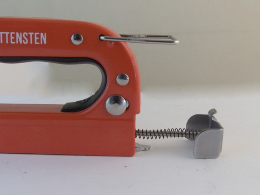 Każdy z łączników ładuje się do otwartego magazynka, a następnie zamyka sprężyną dociskową. Górne pokrętło służy do regulacji siły wbijania, gdy np. oczekujemy, aby np. gwóźdź wystawał ponad drewnianą powierzchnię.