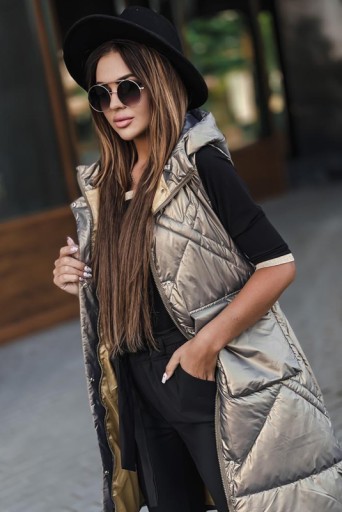 Długa, pikowana kamizelka z kapturem i dużymi kieszeniami.