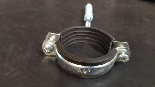 Metalowa ocynkowana obejma do rur, zaopatrzona w gumową uszczelkę, śrubę i kołek.