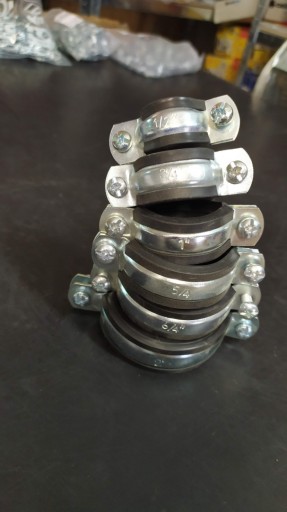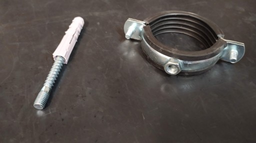 Metalowa ocynkowana obejma do rur, zaopatrzona w gumową uszczelkę, śrubę i kołek.