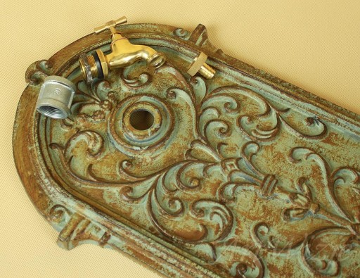 Stojąca wylewka (zlew ogrodowy) z kranem w kolorze zielonym z przetarciami zdobiona symetrycznym ornamentem roślinnym.