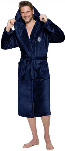 Szlafrok męski z kapturem, wiązany w pasie, z miękkiej dzianiny (soft), na biodrach kieszenie zewnętrzne, na wysokości klatki piersiowej naszyta aplikacja.