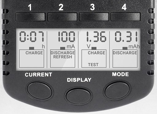 - Wyświetlacz LCD wielosegmentowy, pokazuje parametry pracy każdej komory ładowania: czas ładowania, tryb pracy, prąd ładowania/rozładowania, zliczone mAh (pojemność)
