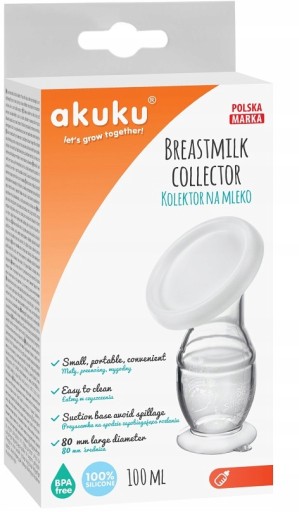 Silikonowy kolektor marki „akuku” pomaga karmiącym mamom zbierać mleko wyciekające z drugiej piersi podczas karmienia. Kiedy piersi są pełne mleka może również posłużyć jako odciągacz. Przy delikatnym ściśnięciu dolnej części kolektora i przyłożeniu lejka do piersi przysysa się do ciała i zbiera pokarm do zbiornika. Rowek na lejku ułatwia przelewanie do woreczka, aby zamrozić pokarm w razie potrzeby.