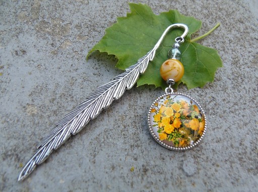 Zakładka do książki, kalendarza, notesu z piękną ozdobą w postaci szklanego kaboszonu z bukietem żółtych róż.