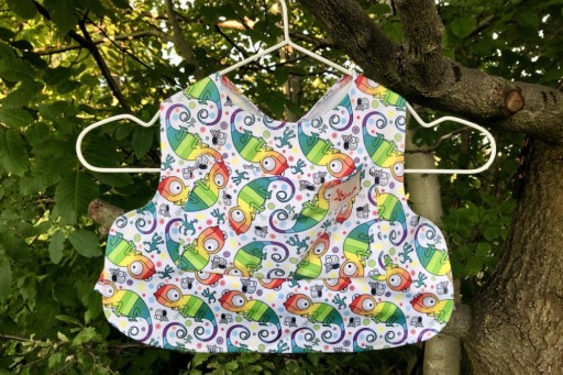 Fartuszek jest uszyty z PULu, tzn. z impregnowanej dzianiny poliestrowej o właściwościach oddychających, a jednocześnienieprzepuszczających wody. Z tego materiału powstają pieluszki wielorazowe dla niemowląt, a nasze fartuszki są uszyte z resztek materiału pozostałego po uszyciu pieluszek NappiMe.