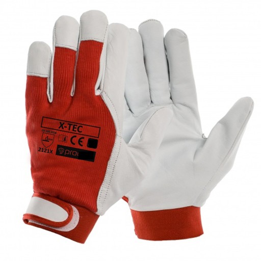- Rękawice X-TEC wykonane w części chwytnej z jednego kawałka licowej skóry koziej , wierzch wykonany z elastycznej tkaniny w czerwonym kolorze.