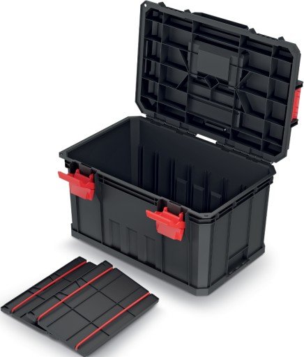 Wewnątrz skrzyni można znaleźć trzy demontowalne przegrody, z których jedna jest również multifunkcjonalnym nosidłem na narzędzia ręczne.