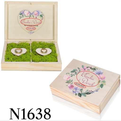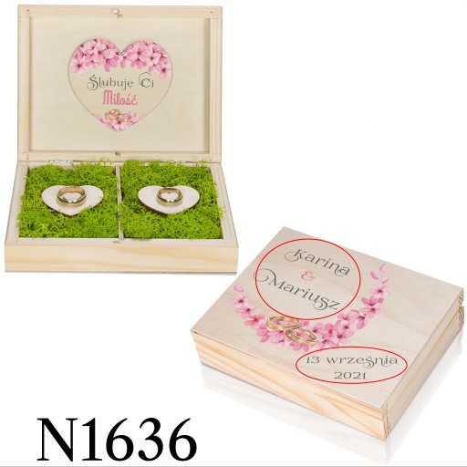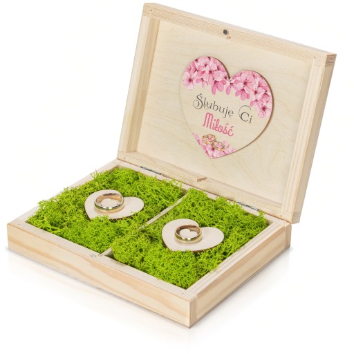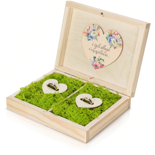 szkatułka na obrączki, drewniane, ślubne, z mchem