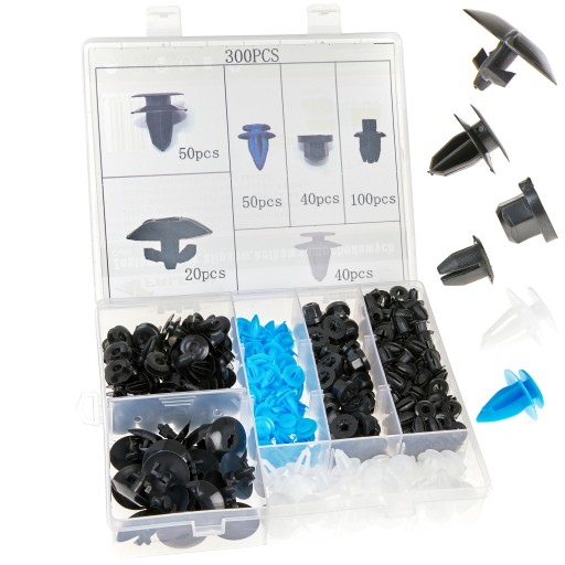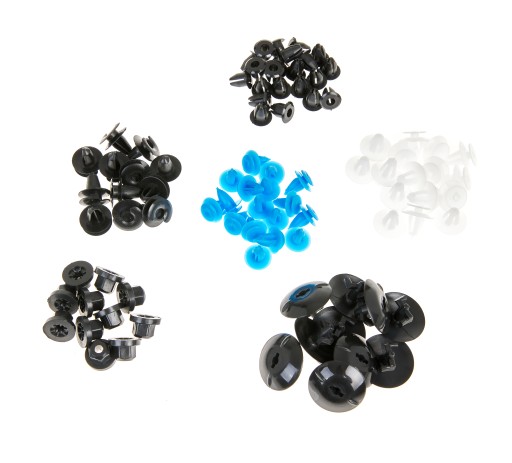 Zestaw plastikowych spinek do samochodów marki Opel Opakowanie zwiera 6 typów spinek, razem 300 spinek. Całość zapakowana w pudełko z wygodnymi przegródkami.