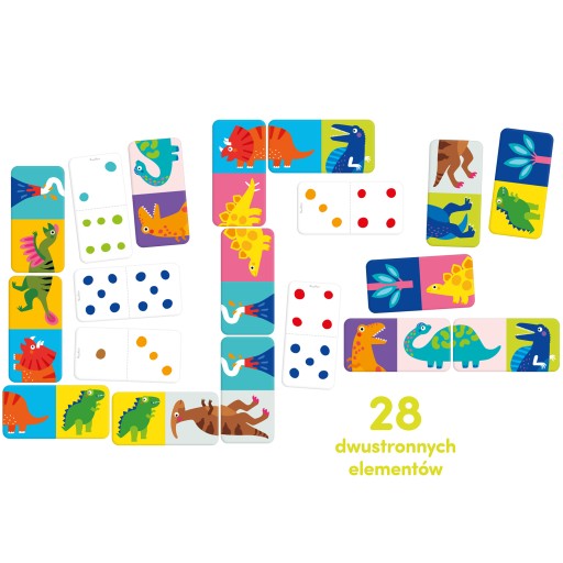 Grr, grr, dinozaury zapraszają do wspólnej zabawy! Edukacyjny zestaw zawiera 28 dużych dwustronnych elementów. Umożliwia wiele wszechstronnie rozwijających zabaw: można bawić się nimi jak układanką lub zagrać w obrazkowe lub klasyczne domino. To doskonały pomysł na pierwszą grę dla maluchów i grę rodzinną.