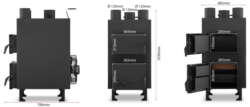 Jak to działa? Palenisko pieca otoczone jest bezpośrednio bardzo wydajnym płaszczem powietrznym, w którym powietrze nagrzewa się a następnie jest transportowane przez system kanałów do dwóch wylotów powietrza o średnicy fi=120mm umieszczonych na górnej płycie pieca. Za przepływ i tłoczenie powietrza odpowiedzialny jest wydajny i cichy wentylator osiowy tłoczący o średnicy Ø 300mm i wydatku 2910 m3/h. Całe palenisko wyposażone jest w wymienne żeliwny ruszt tabliczkowy o wymiarach 190 x 320mm.