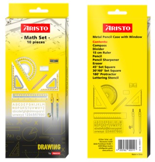 Zestaw geometryczny szkolny - zawiera 10 elementów: linijkę, 2 ekierki, kątomierz, szablon literowy i cyfrowy, przenośnik, tzw. kroczek, cyrkiel z ołówkiem, strugawkę oraz gumę do mazania. Całośc w eleganckim blaszanym etui.