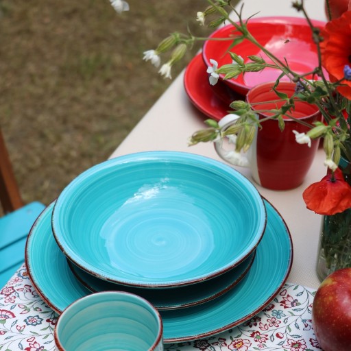 Mamy do zaoferowania piękny zestaw ceramicznych talerzy obiadowych o 6 odcieniach koloru czerwonego/ pomarańczowego/ żółtego/ zielonego/ niebieskiego/ fioletowego.