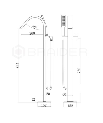 BRAIDER BATERIA WANNOWA WOLNOSTOJĄCA LACERTA chrom słuchawka prysznicowa