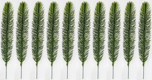 Aukcja dotyczy zestawu 10 sztucznych gałązek świerkowych.
