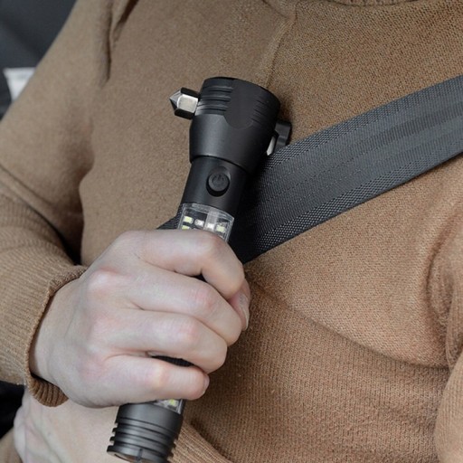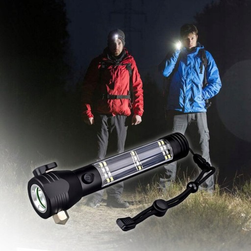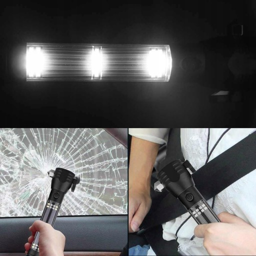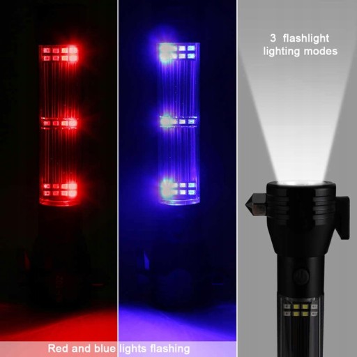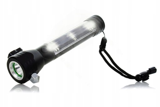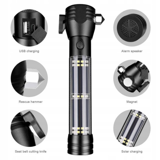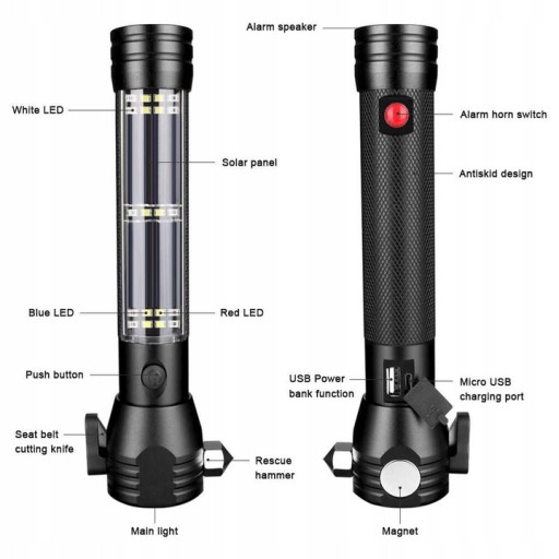 Głowica lampy wyposażona jest w magnes, młotek i nóż, który w razie potrzeby może przeciąć pas bezpieczeństwa w samochodzie. Na końcu lampy znajduje się głośnik 120dB, który posiada alarmy ostrzegawcze POLICJA STRAŻ POGOTOWIE. Wejście USB służy do ładowania latarki, a wejście micro USB jest przeznaczone do telefonu komórkowego, gdzie można używać latarki jako power banka!