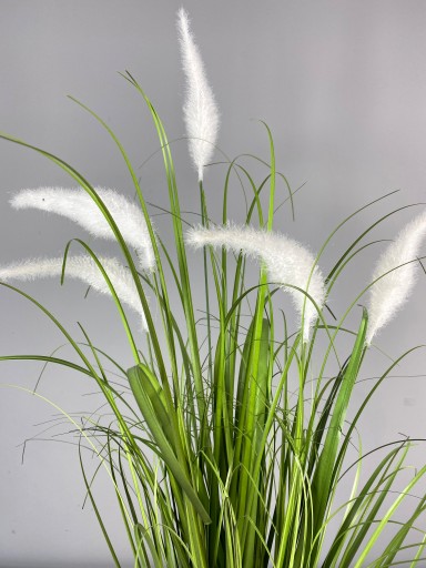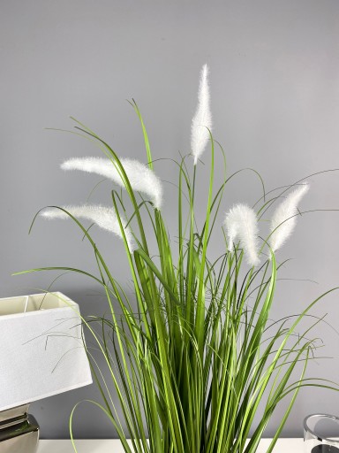 Przedmiotem sprzedaży jest wysokiej jakości sztuczna trawa z białymi ozdobnymi kłosami, idealnie imitująca żywą roślinę. Trawa jest gęsta, gruba i rozłożysta. Ociepli każde wnętrze, dom, restaurację lub biuro.