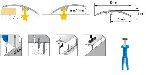 Listwy aluminiowe pokryte drewnopodobną okleiną umożliwiają wyjątkowo estetyczne wykończenie łączenia rożnych nawierzchni podłogowych, są idealnym rozwiązaniem do łączenia wykładzin z parkietem lub terakotą, tym bardziej, iż niwelują ewentualną różnicę poziomów. Niewątpliwą zaletą tych listew jest niewidoczny sposób mocowania do podłoża. Listwa pokryta jest bardzo trwałym laminatem, o dużym stopniu odporności na ścieranie.