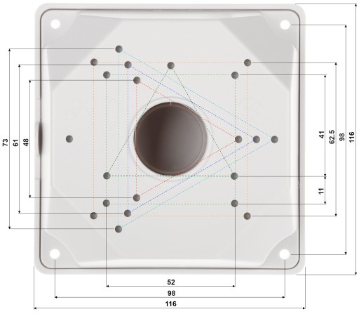 Odpowiedni dla kamer: APTI Materiał: Tworzywo sztuczne Kolor: Biały Dystans od powierzchni montażu: 49 mm Waga: 0.12 kg Wymiary: 116 x 116 x 49 mm Gwarancja: 2 lata