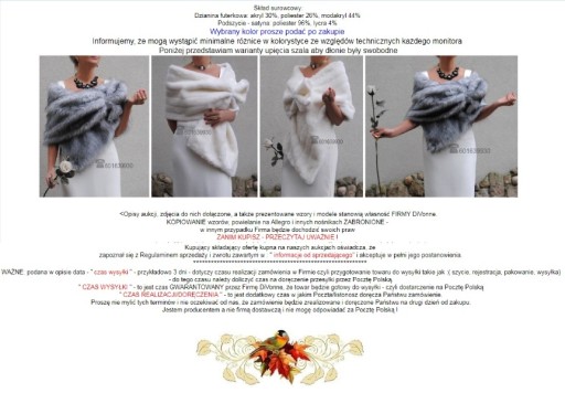 Na tej aukcji kupujesz szal w wymiarze: 36 cm x 170 cm w cenie 185 zł wraz z usługą szycia, nie podlega zwrotowi.