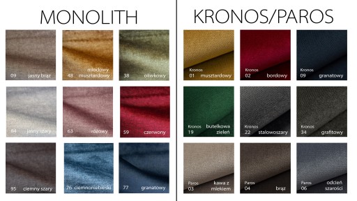 Poniższe zdjęcia prezentują mebel w tkaninie Kronos/Paros - gładka, przyjemna w dotyku tkanina welurowa, charakteryzująca się intensywnym cieniowaniem oraz połyskiem, które urozmaicają kolorystykę. Materiał oferuje szeroką paletę barw i ciekawie prezentują się zarówno na mniejszych meblach, jak i większych konfiguracjach.