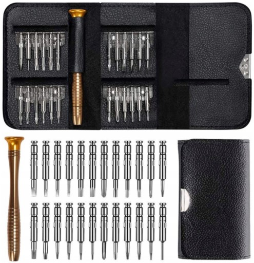Zestaw posiada aż 24 wymienne wkrętaki oraz 1 uchwyt bazowy. Części wykonane są z najwyższej jakości stali. Wszystko zapakowane w oryginalnym skórzanym etui, które zapobiega przed zagubieniem poszczególnych elementów i ułatwia transport. Zestaw nada się perfekcyjnie dla osób zawodowo zajmujących się naprawą i konserwacją oraz dla domowych majsterkowiczów.