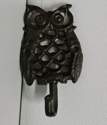 Żeliwny wieszak na klucze w kształcie sowy.