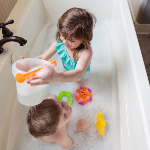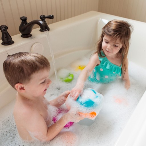 Dwie gwiazdki i trzy kolorowe, faliste pierścienie niecierpliwie czekają, aż najmłodsi wyjmą je z wiaderka i wrzucą do kąpieli, lub będą układać w piramidkę. Pierścienie można układać na sobie, lub gwiazdki na pierścienie, w kubełku i poza nim, w kąpieli i poza nią, lub wymyśl własną konfigurację – nie ma złego sposobu na zabawę! Kubełek ma dziurki w podstawie, w wannie woda będzie z niego tryskać jak deszcz, a poza nią masz pewność, że nie będzie wody na dywanie.