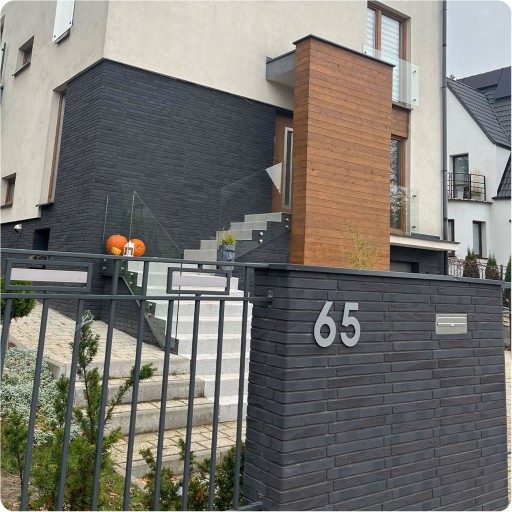 Cyfry mają 20 cm wysokości, a litery tzw. "DRUKOWANE" 13 cm. Do każdej cyfry, litery czy znaku dołączamy specjalny uchwyt, który sprawia, że montaż jest niewidoczny, a numer efektownie odstaje od ściany 5 mm. W zestawie są również niezbędne kołki do betonu i styropianu.
