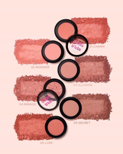 Dzięki różom CHEEKS TRICKS i sztuczkom, które uzyskach za ich pomocą, zachwycisz świeżą i wypoczętą cerą oraz młodzieńczym, promiennym look’iem. Bogata kolorystyka oraz różne efekty wykończenia makijażu, od pełnego matu, przez satynę, do subtelnego błysku, pozwolą na wybranie różu idealnego, a może też skuszą do wypróbowania techniki drapingu?!